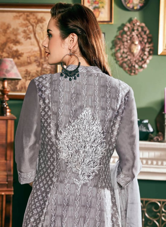 Grey Chanderi Batic Layered Drek With Skirt & Scarf